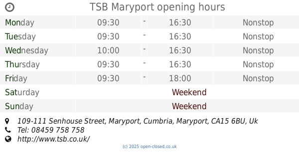 It is also possible to : Edit these OPENING HOURS of Branch TSB In Maryport, 109-111 Senhouse Street, Maryport, Cumbria,